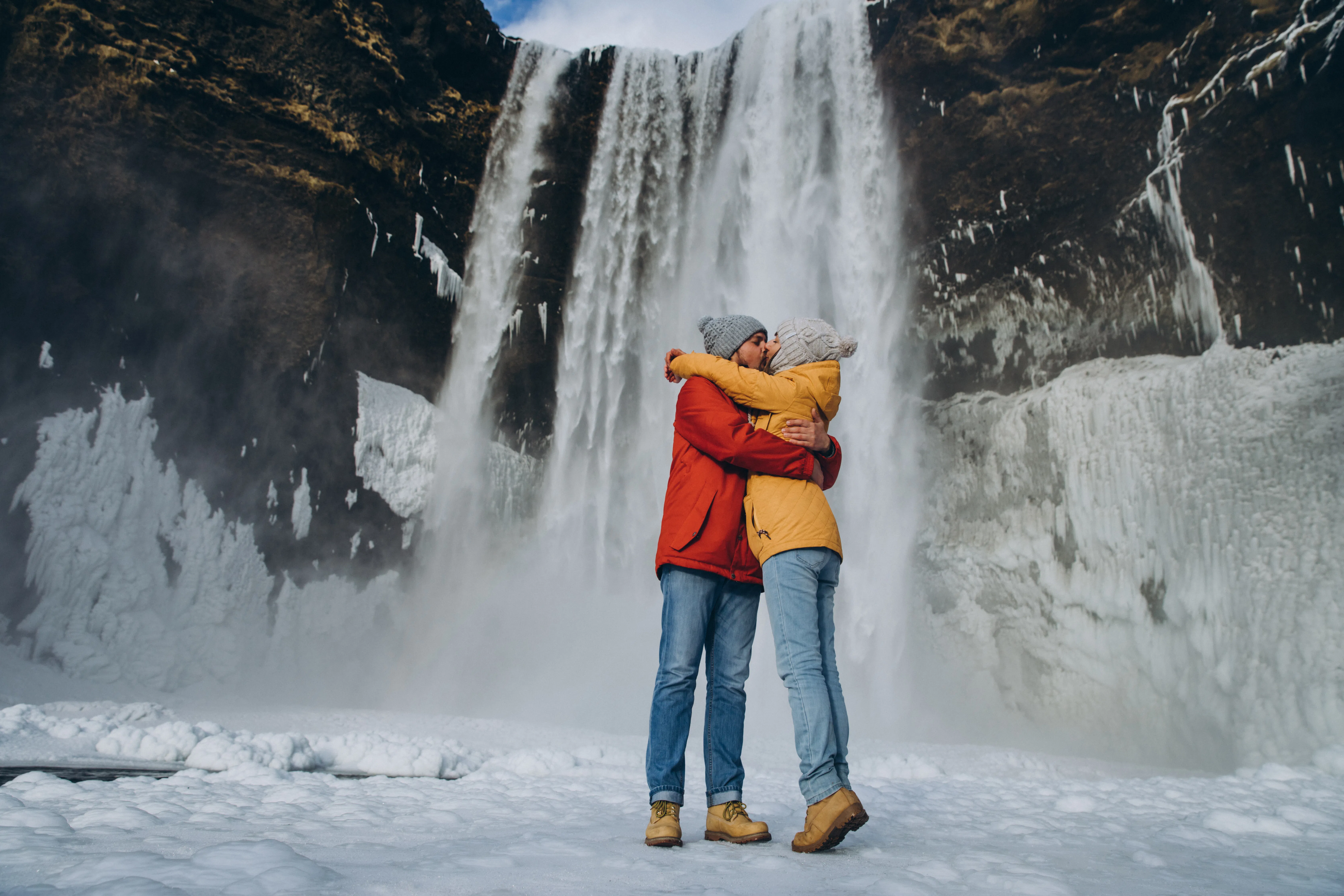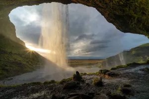 Our adventure begins with visits to two of Iceland’s most famous waterfalls. First, we’ll witness the enchanting Seljalandsfoss, where the water cascades 60 meters (197 feet) into a tranquil pool below. This waterfall is part of the Seljalands River, which originates from the volcano glacier Eyjafjallajökull1. One of the most unique features of Seljalandsfoss is that you can walk behind the waterfall (when it’s not frozen), feel the mist on your face and capture unforgettable photos.