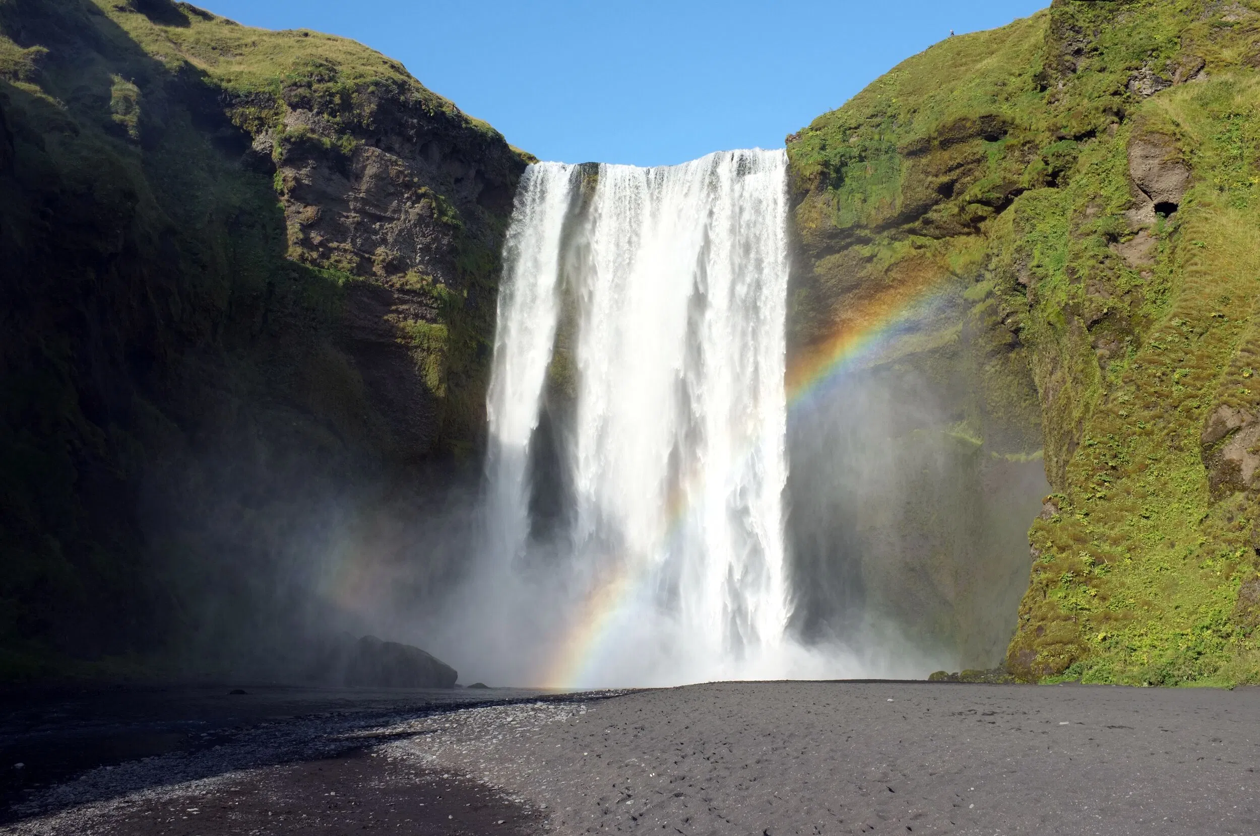 Next, we’ll visit Skógafoss, a wider and equally magnificent waterfall. The waterfall is 25 meters (82 feet) wide and has a drop of 60 meters (197 feet). The thundering water creates rainbows in the mist, offering a magical spectacle. The waterfall is part of the Skógá River, which also comes from the Eyjafjallajökull glacier. The sheer power and beauty of these falls are a testament to Iceland’s raw natural splendour. According to legend, the first Viking settler in the area buried a treasure in a cave behind the waterfall. If you’re feeling adventurous, you can climb the 527-step staircase to the top of the waterfall and enjoy a stunning view over the southern coastline of Iceland.
