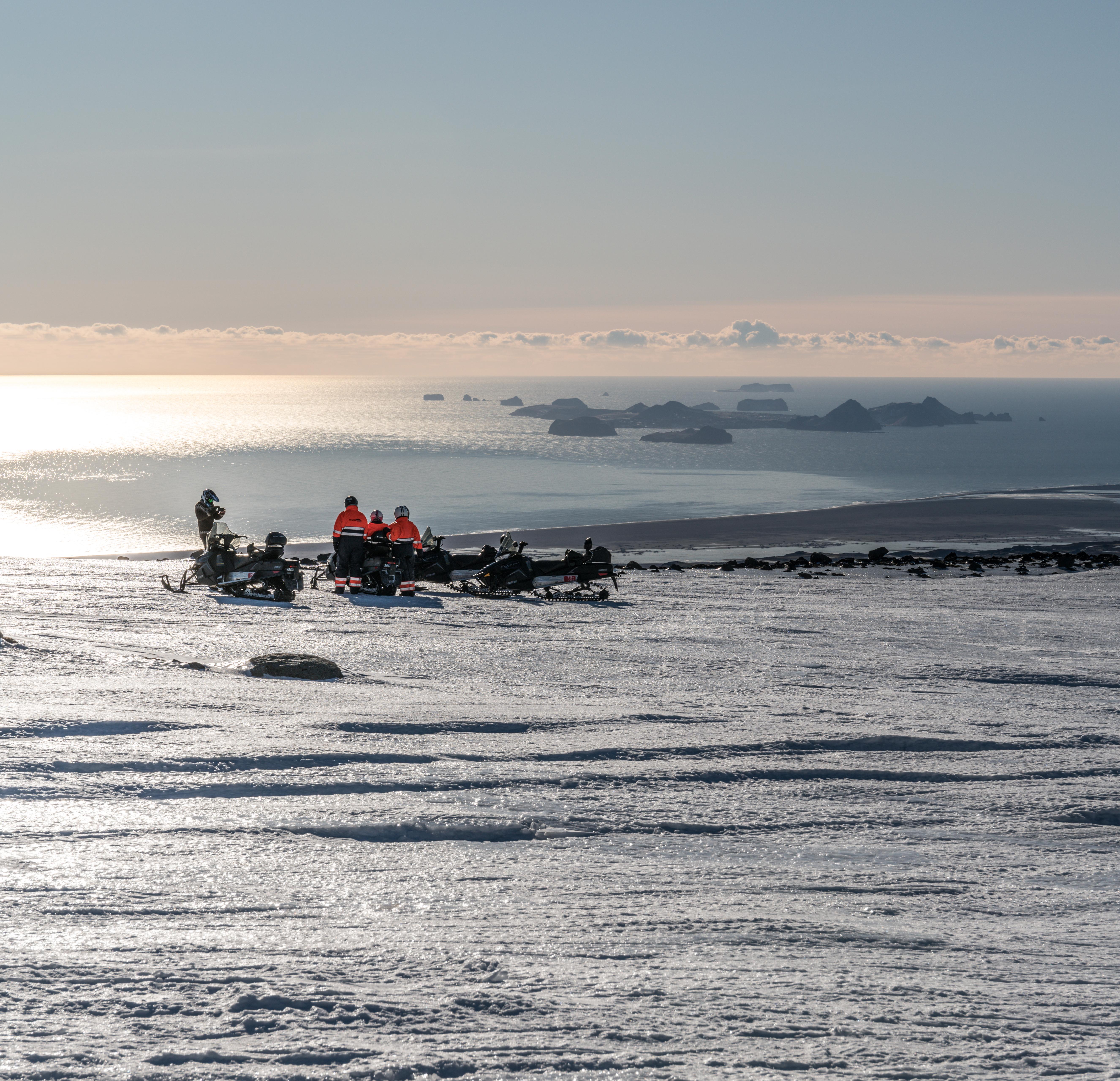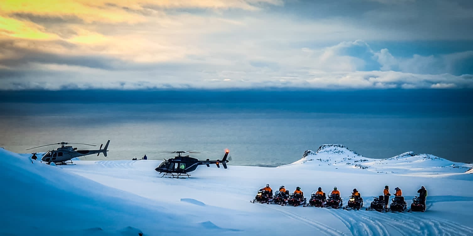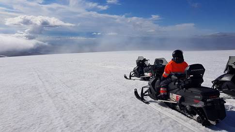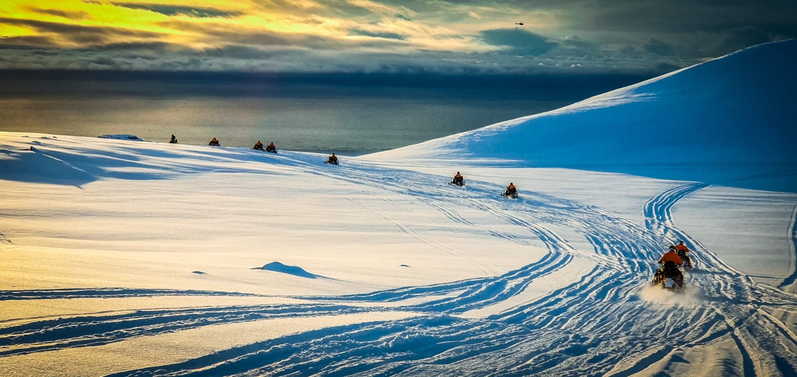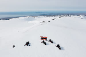 While the south is certainly spectacular from "below” nothing beats experiencing it from "above”, snowmobiling on top of Eyjafjallajökull glacier. The snowmobile tour is the perfect length of time for first-time riders and individuals looking for a scenic, fun ride, exploring and experiencing the wilderness, glacier and the breathtaking views over South Iceland in good weather. The tour starts from our base, after a short briefing and dressing up in a snow suit we step into a Super jeep and we drive up the mountain, to the glacier where we pick up the snowmobiles and ride to the glacier Eyjafjallajökull.