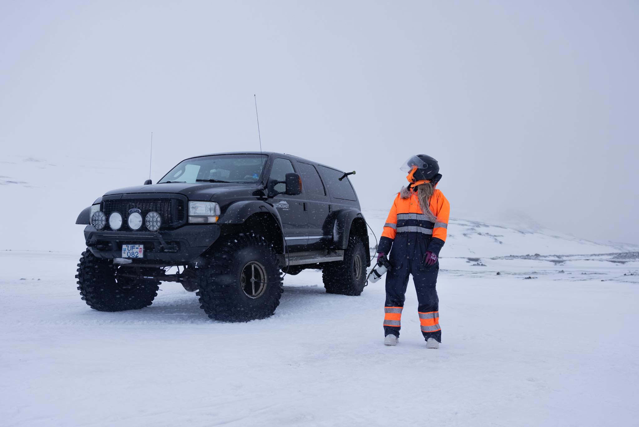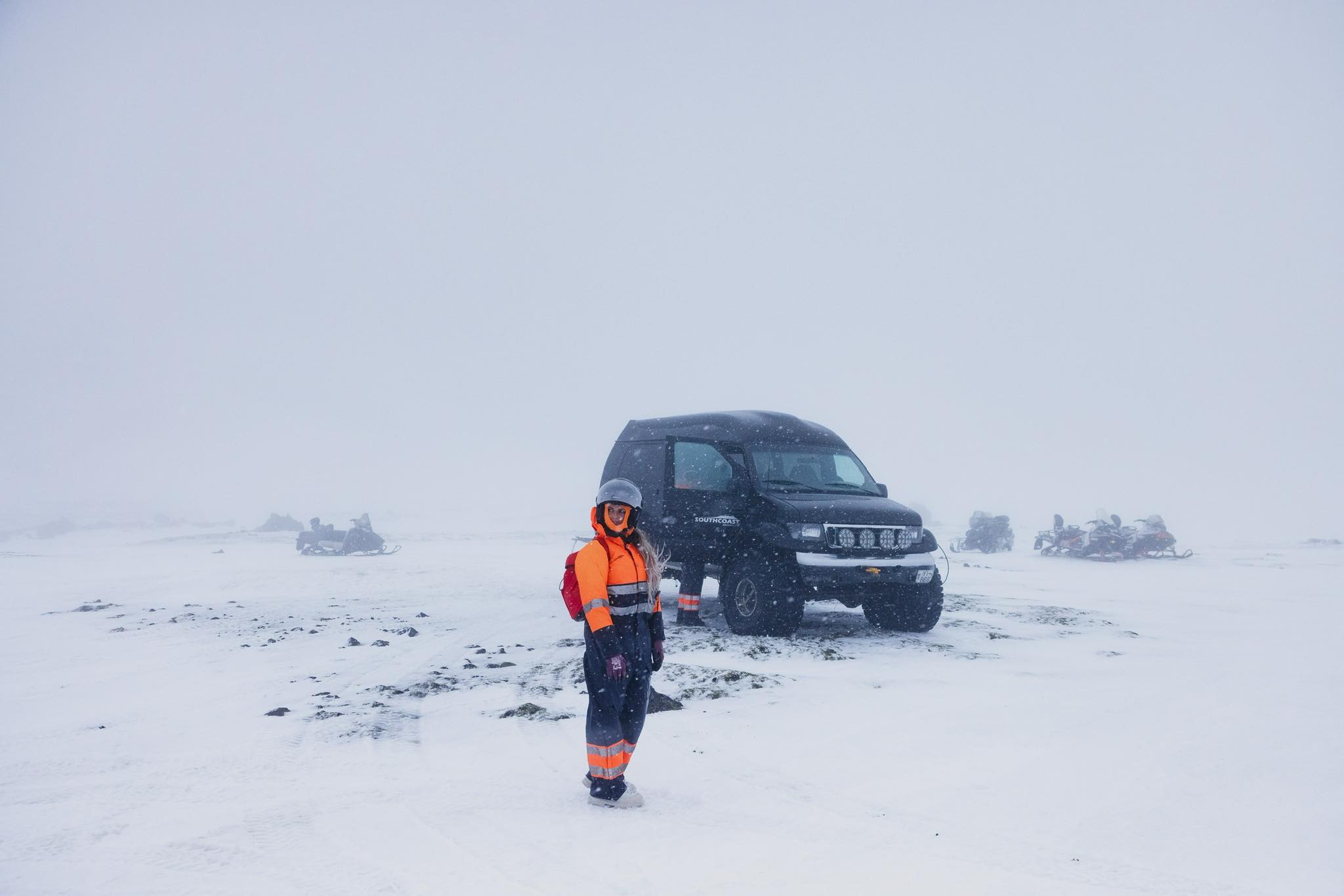 The tour starts from our base, Brú, road 249, 7 minutes further down that road after you have pass Seljalandsfoss waterfall. After a short briefing where your guide takes you through safety procedures we put on a snow suit and helmet (gloves and a mask are also provided) and hop into our modified super jeep. We then drive towards Eyjafjallajökull and up it's slopes, onto the glacier and to the base where we keep our snowmobiles.