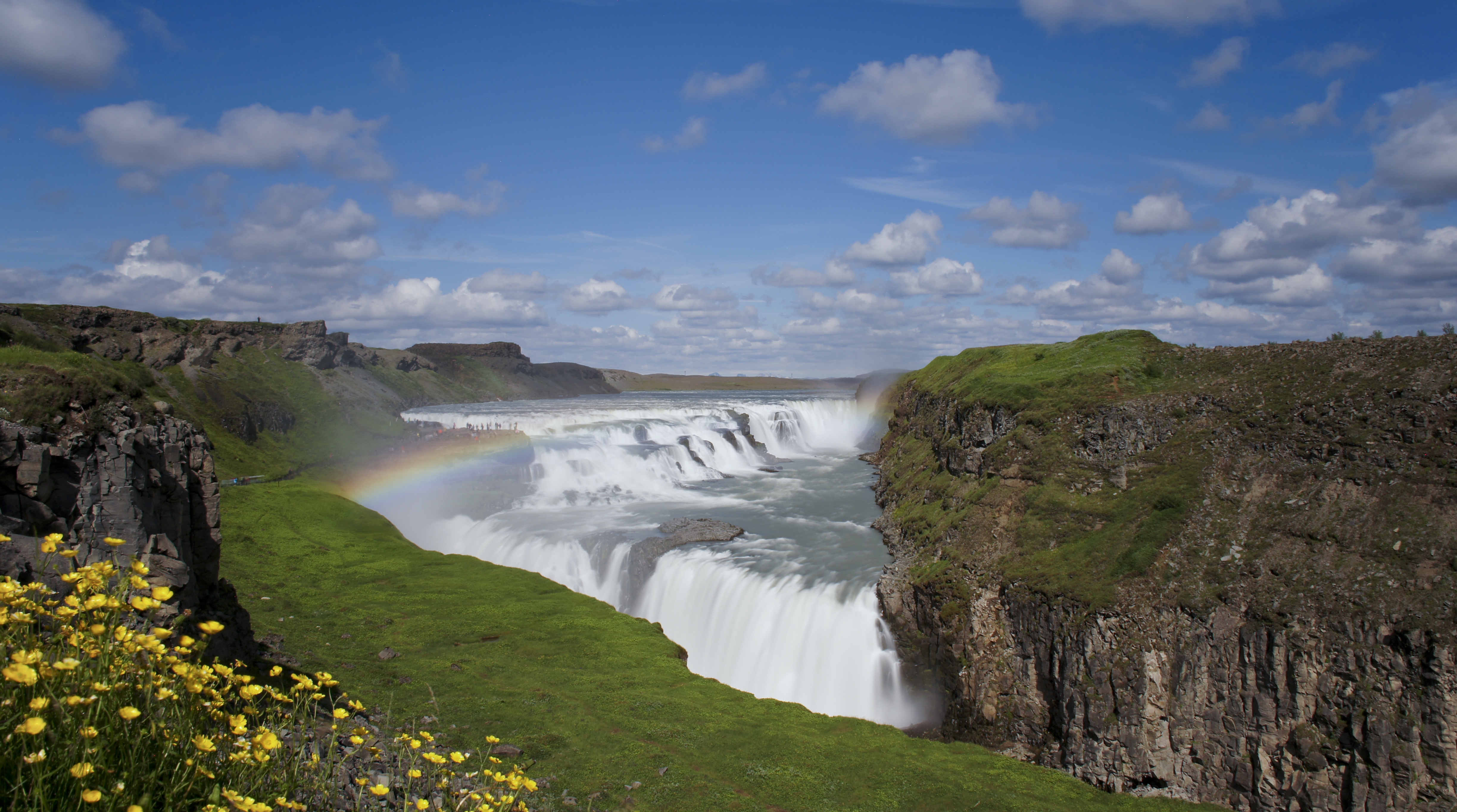 Water flows over Gullfoss at an average rate of 109 cubic metres per second. The heaviest floods have recorded a flow of 2000 cubic metres per second. During the summer the flow is 130 cubic metres per second, which would take only 3 seconds to fill this building. People were eager to exploit the power potential of Gullfoss and many plans for hydroelectric developments on the river Hvítá have been proposed.
