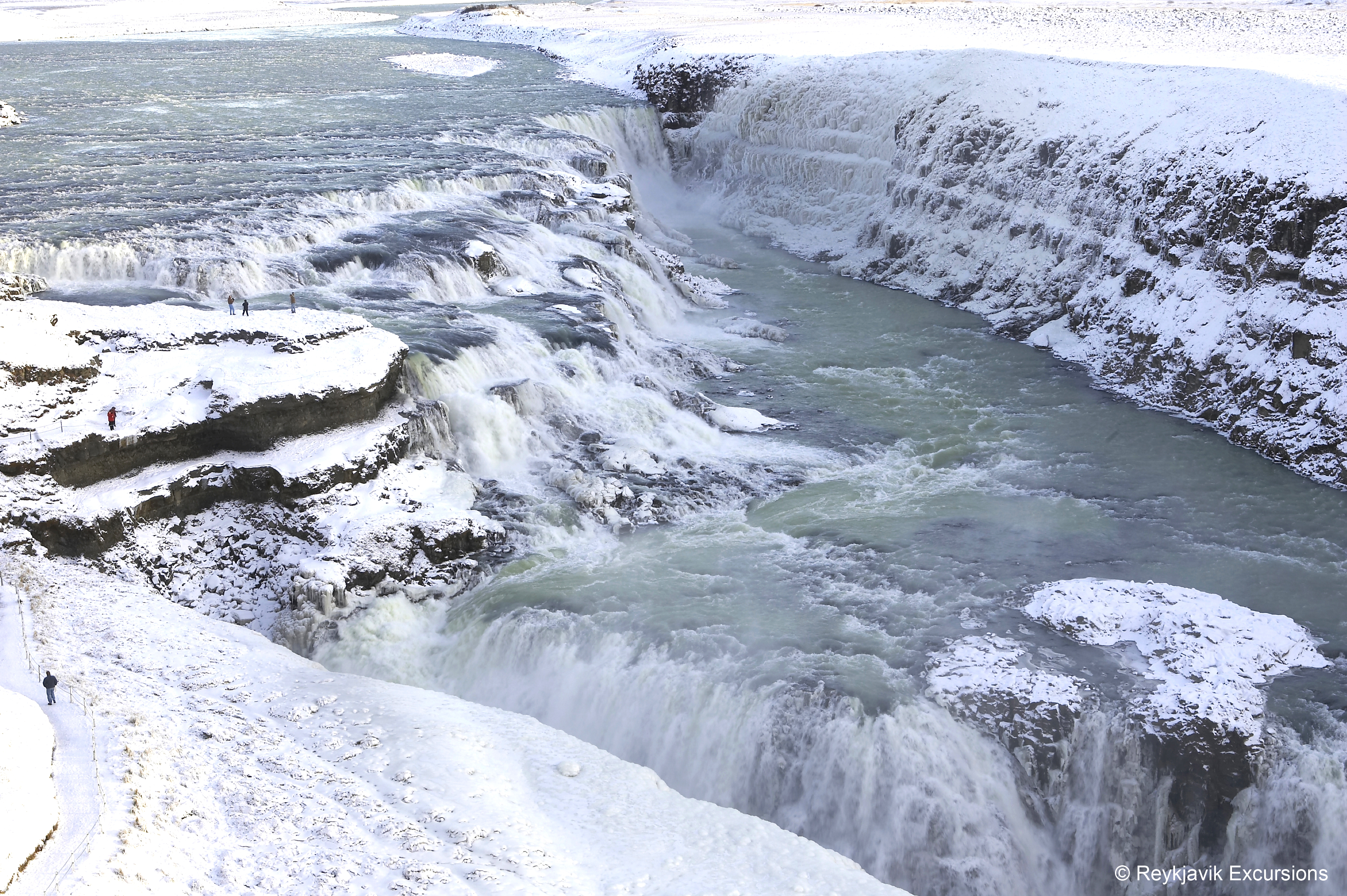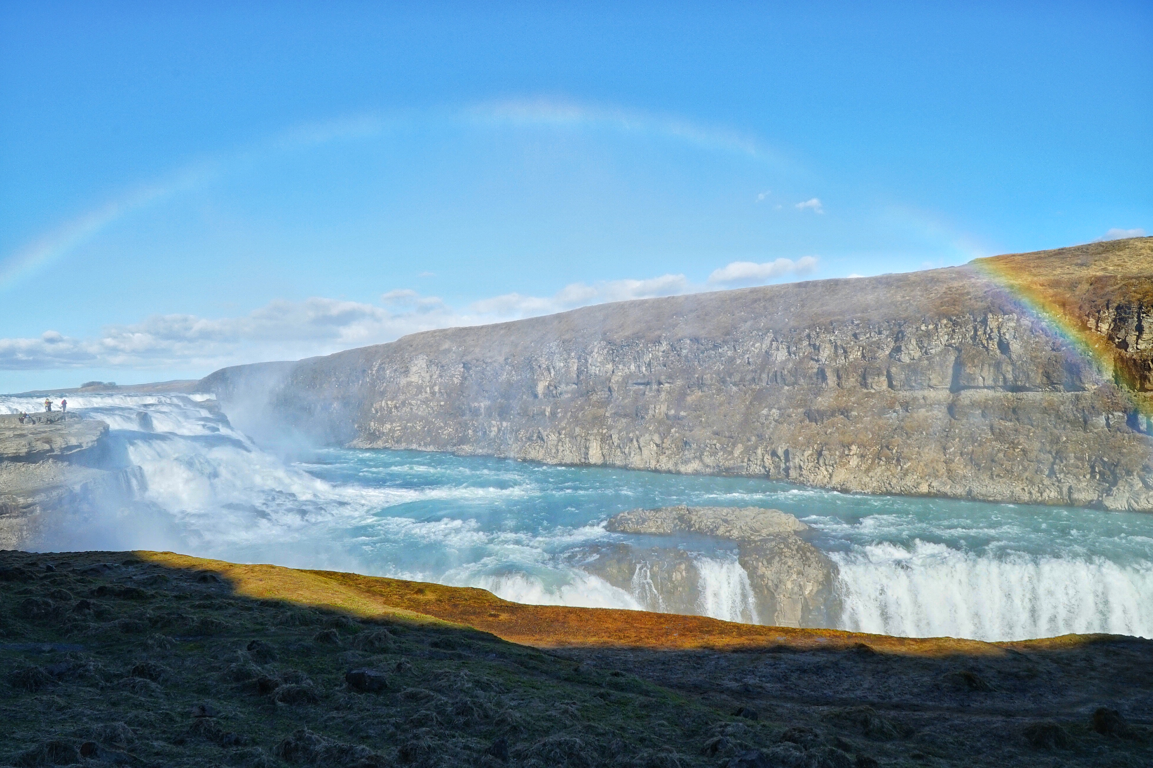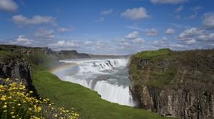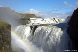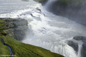 Gullfoss is actually two separate waterfalls, the upper one has a drop of 11 metres and the lower one 21 metres. The rock of the river bed was formed during an interglacial period.