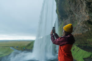 From there, we continue to the iconic Seljalandsfoss, the waterfall you can actually walk behind (if you don’t mind a light mist!). Just a short drive away is Skógafoss, a massive 60-meter waterfall that creates beautiful rainbows on sunny days.