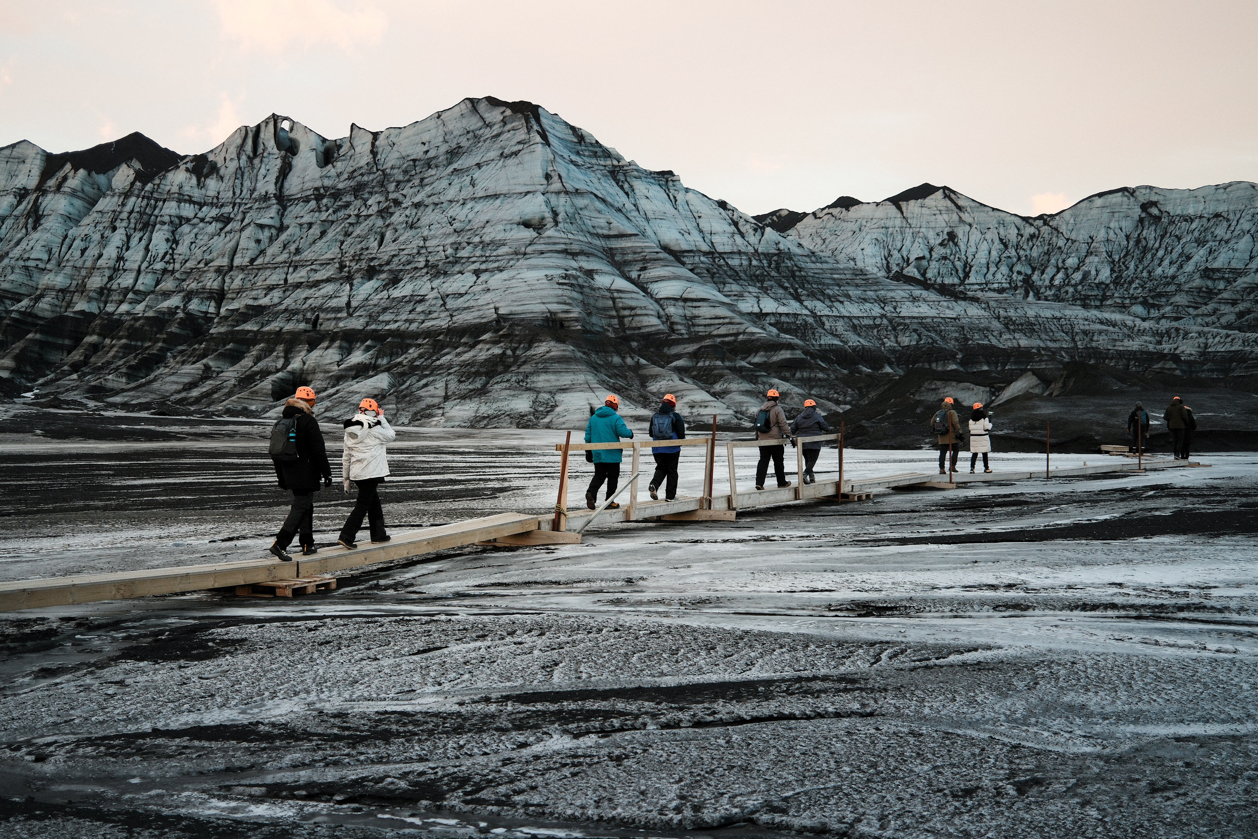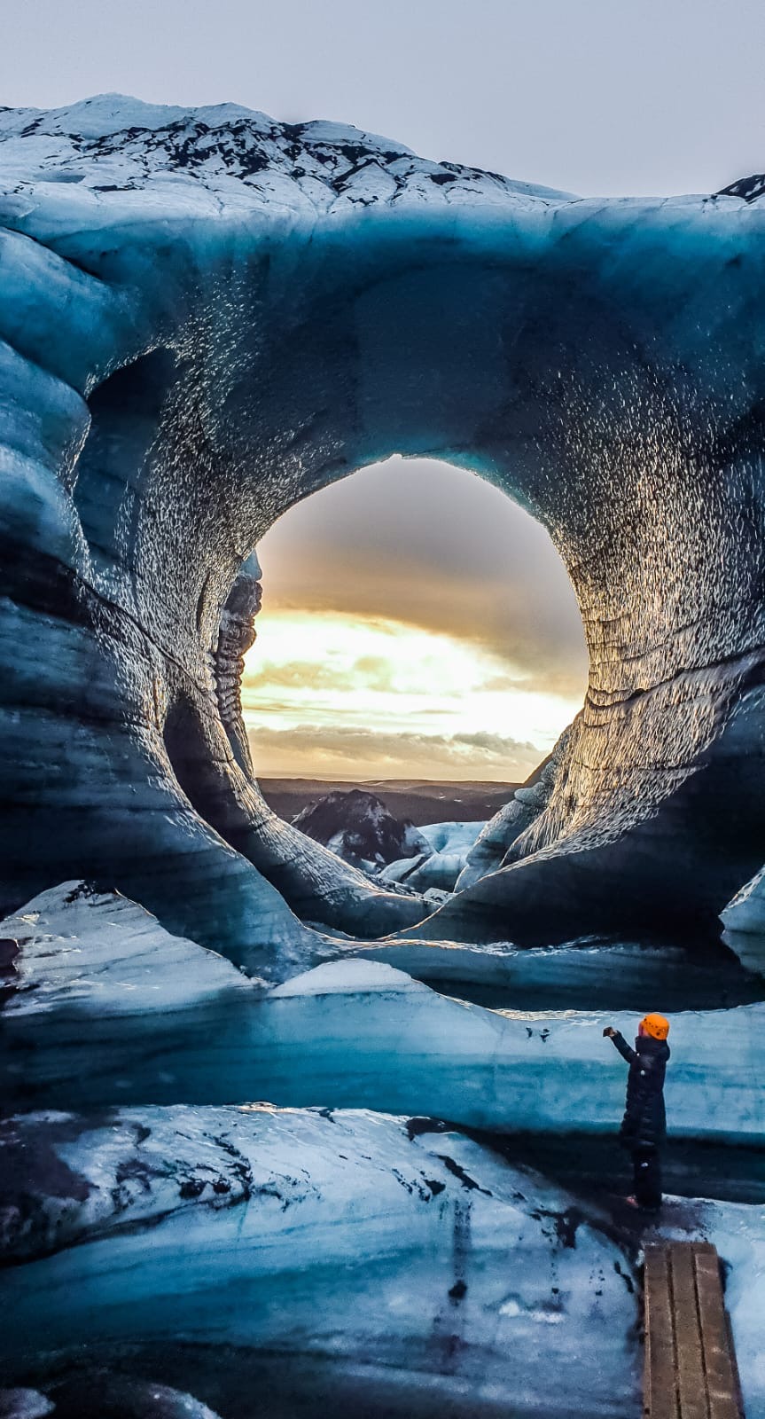 We will come to a stop near the roots of Kötlujökull glacier and the view that greets us is otherworldly. We will take on our crampons and helmets, and take a short walk to the opening of the ice cave. We might need to climb a few steps on ladders to the entrance of the cave. As the natural ice cave is in a constant change, conditions can be different at each tour. The climb is, however, not difficult at all and anyone in an average physical condition should be able to climb these steps. It might look adventurous but it is not demanding at all!
