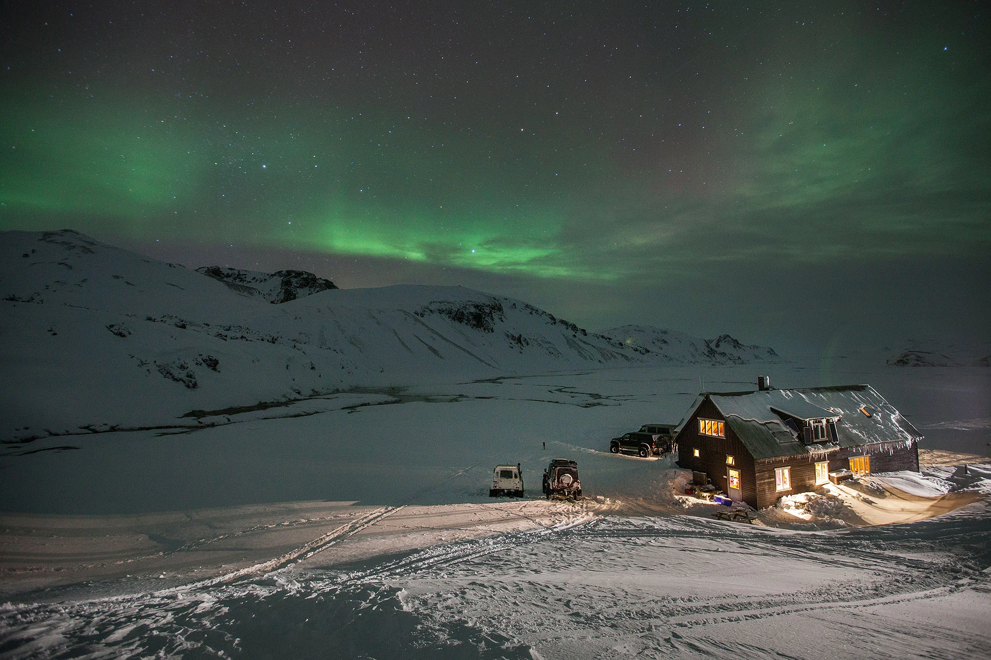 A day spent in the discovery of Ljótipollur, an enormous crater born out of a series of eruptions that rattled the region in the 15th century. The crater, which erupted on a fissure segment and is about 1.5 km long, is the home of an impressive lake. From underneath its white winter coat, we’ll most probably catch a glimpse of the black and red colours of its steep rocky walls. We continue the loop to the imposing mountain Kirkjufell before returning to the hut and a hot bath.