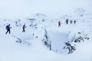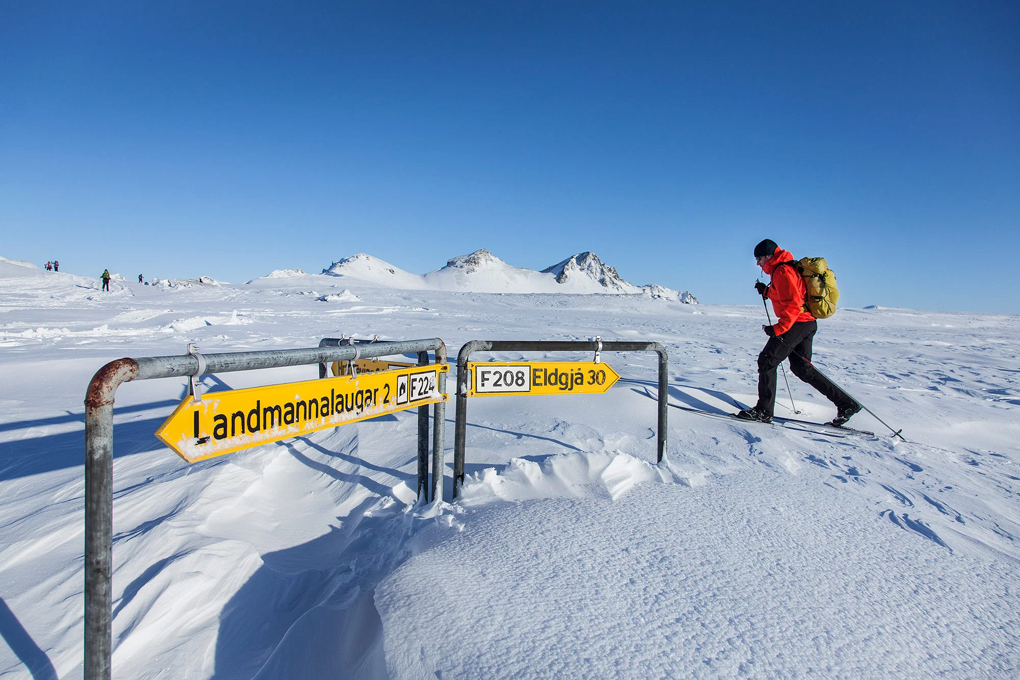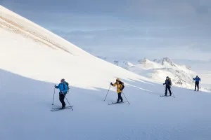 Day 1: Reykjavík - Sigalda - LandmannalaugarEarly pick up from the accommodation at 07:30. Leaving Reykjavík we head east on the road of Hellisheiði. After passing the village of Selfoss, we push north-west into Iceland’s interior, in the direction of the Atlantic rift. This road, the only road to the mountains that is cleared of snow, brings us to Sigalda, 23 km from Landmannalaugar where our vehicle drops us off. Here we put on our skis and set course in the direction of the lava fields of Bjallahraun. Our path takes us over the Hnausar pass, where it slightly descends to the lake Frostastaðavatn, before arriving at Landmannalaugar. We set camp in the mountain refuge where our luggage awaits us, and take our first hot bath just s few dozen meters from the hut.