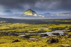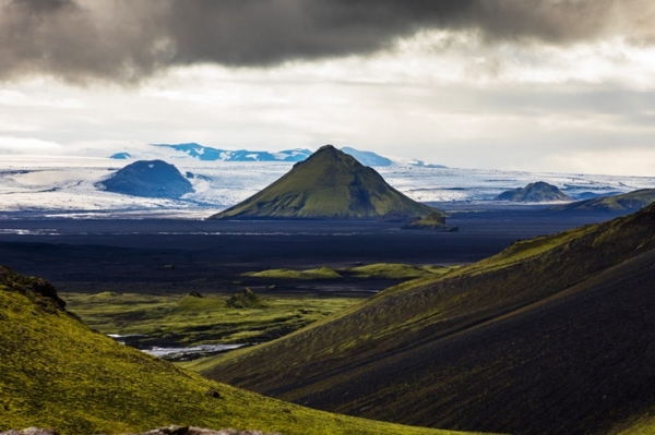 The volcano remains close to this ice cap, just to its north. As such, it is surrounded by volcanic landscapes and many pristine glacier rivers. It is particularly renowned for its vivid green colouration in summer, which contrasts starkly with the black sands that encircle it. Because of its beauty, Maelifell has been featured in films such as Noah and television series such as Game of Thrones.