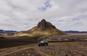 Mount Mælifell (“Measure Hill") is one of Iceland’s most iconic landmarks, an awe inspiring, green moss covered pyramid standing alone in a vast, black desert landscape. This unforgettable visit to Mount Mælifell volcano is like a journey to another world.