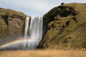 Discover the magic of Seljalandsfoss, one of Iceland’s most iconic waterfalls, where you can walk behind the cascading water and enjoy the view from every angle. Continue to Skógafoss, a majestic waterfall that drops 60 meters and often reveals shimmering rainbows in its mist.