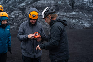 The Super Jeep takes you off-road where you can take in the lunar landscape and incredible views. Then it’s time to gear up with crampons and step onto the glacier! Prepare to immerse yourself in a cinematic landscape as you explore the stunning blue ice and striking black volcanic ash of Mýrdalsjökull Glacier. Your certified glacier guide will share expert insights about this incredible natural wonder.